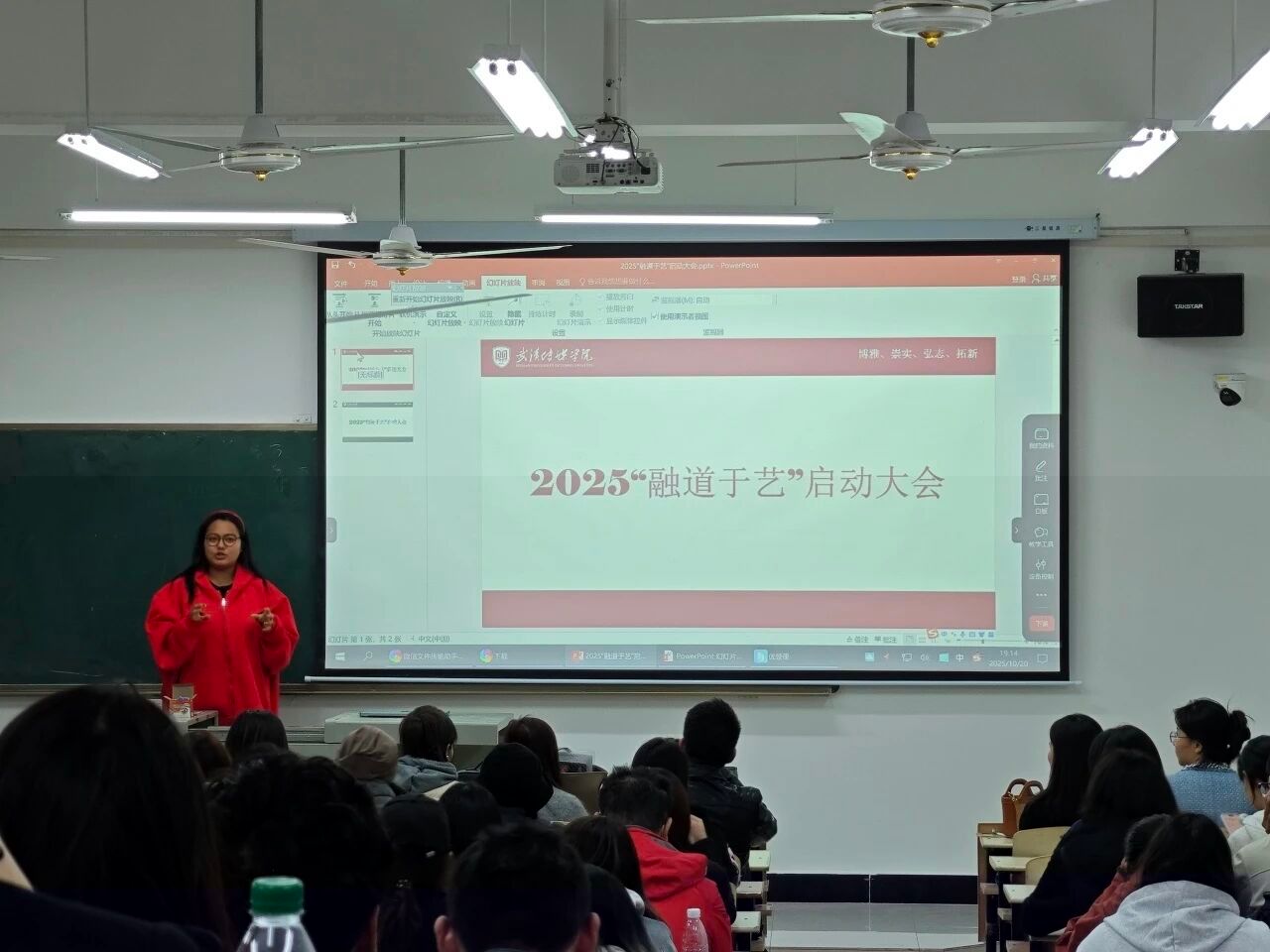 會議伊始,胡桐老師宣布2025“融道于藝”啟動大會正式開始。主持人邊雨璇對排練紀律進行了強調:“融道于藝”系列活動是學院深化文化育人的重要舉措,每一位參與的同學都應以嚴謹的态度對待排練,以此避免排練出現疏漏。此外,她還強調,銜接好各個環節,更是确保活動順利舉行的前提。